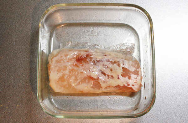 ラップでぴったりと包んで、一晩冷蔵庫で漬ける。