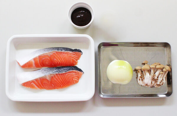 アルミホイルを2枚切り、それぞれの中央に玉ねぎを平たく敷き、鮭としめじをのせ、献立みそを大さじ1と1/2ずつかけ、隙間ができないように包む。