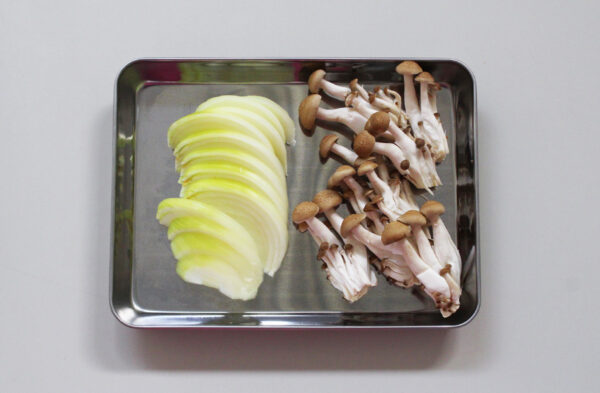 玉ねぎは5mm幅に切る。しめじは石づきを切ってほぐす。