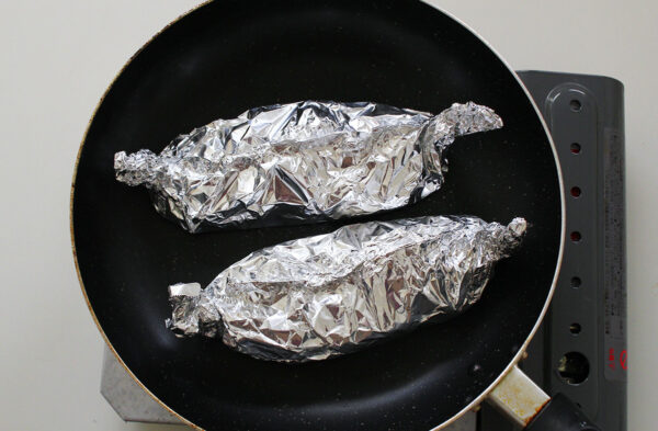 (2)をフライパンに並べ、周りに水を5mm程入れてフタをして、中火で15分(火が通るまで)蒸し焼きにする。