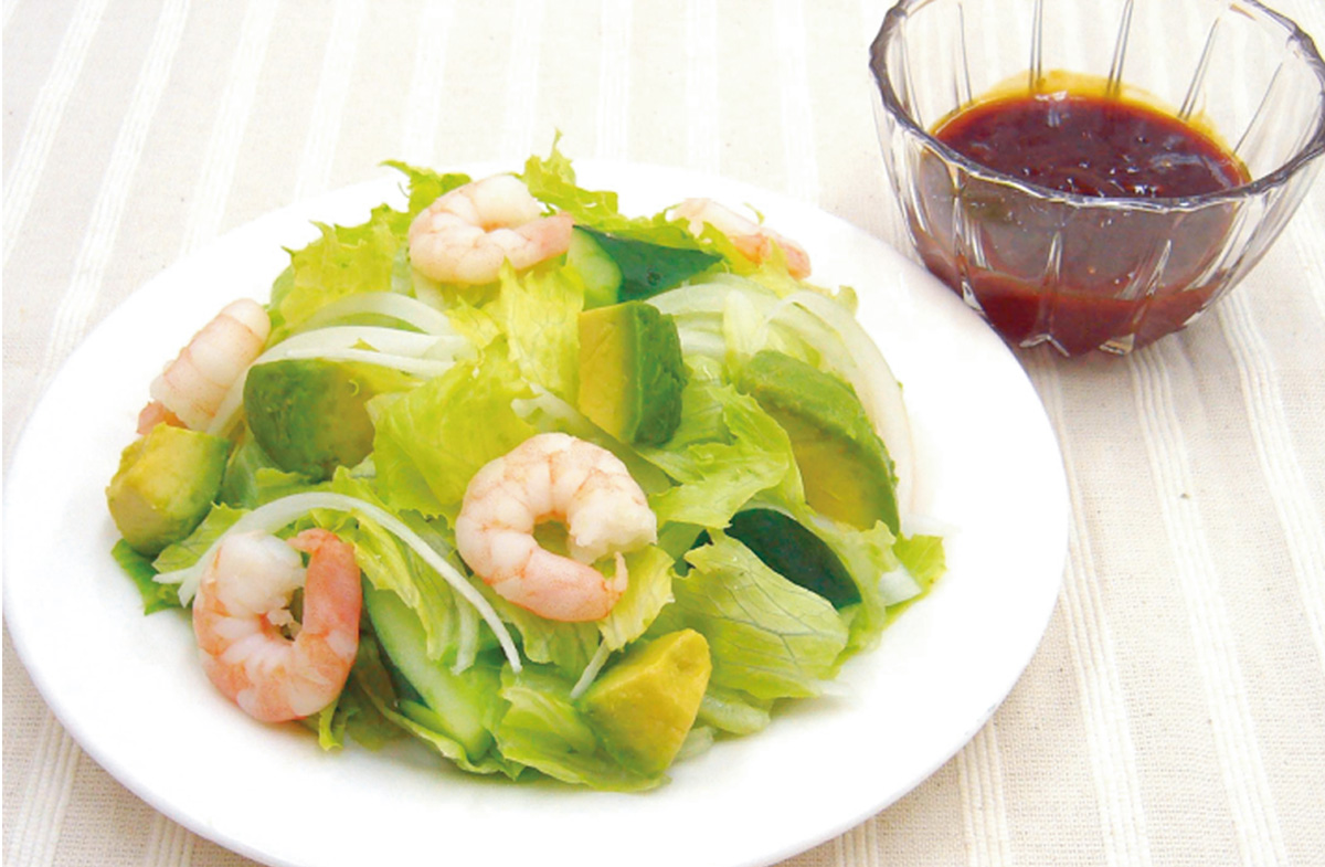 アボカドは種を取り、一口大に切る。きゅうりは小さめの乱切りにする。玉ねぎは薄く切って水にさらし、水気を切る。レタスは食べやすい大きさにちぎる。