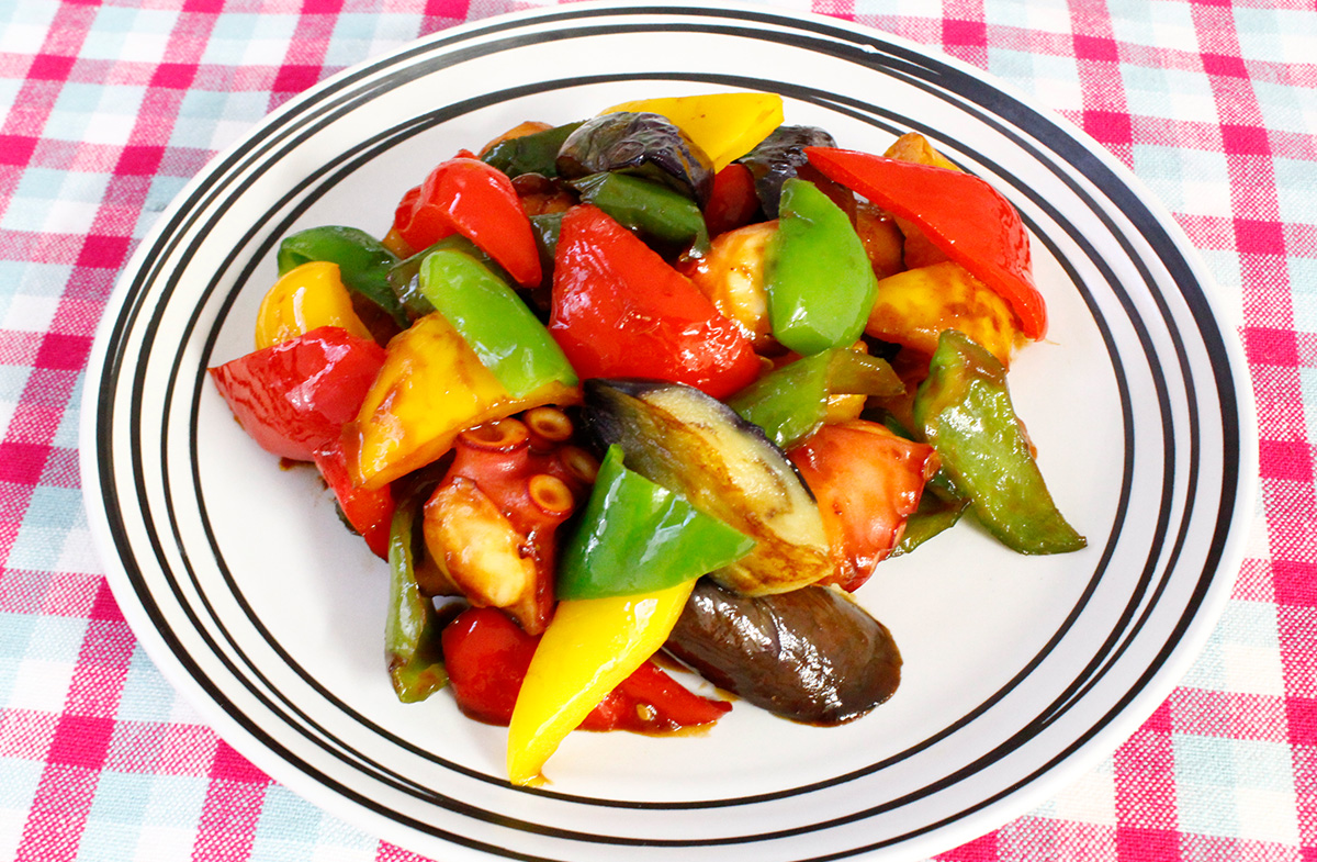 旬のタコになす、ピーマン、パプリカを合わせて、中華風の味付けでコク深く炒めます。味噌の旨みたっぷりで、ご飯がすすみますよ!