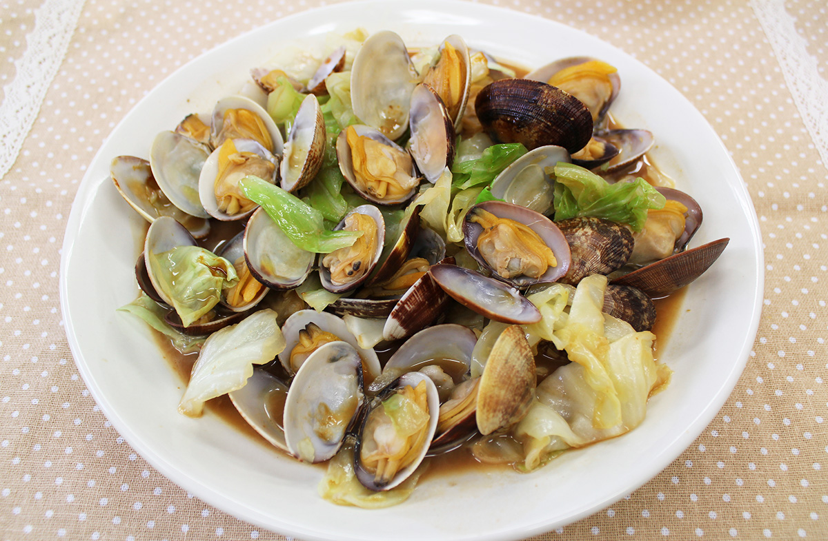 フライパンに油を熱し、にんにくを炒め、香りが出たら、アサリ、キャベツを加える。