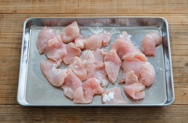 鶏肉は一口大のそぎ切りにし、片栗粉をまぶす。