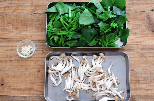 ほうれん草は4cm幅に切る。にんにくはみじん切りにする。しめじは石づきを取ってほぐす。