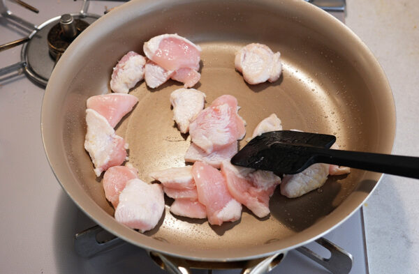 フライパンに油を熱し、にんにくを入れて中火で炒める。香りが出てきたら鶏肉を入れて色が変わるまで炒める。