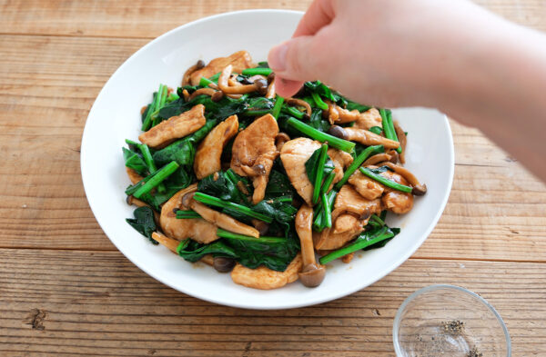 皿に盛りつけて、お好みで粗挽き黒こしょうをトッピングする。