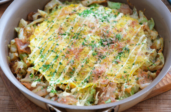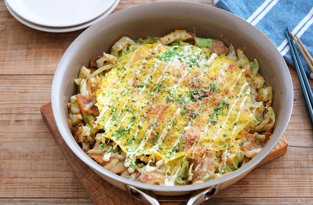 赤から鍋スティックで仕上げる旨辛なとん平焼きです。フライパンのまま食卓に出すことができて形が崩れないのも嬉しい!