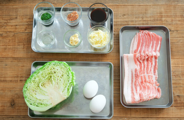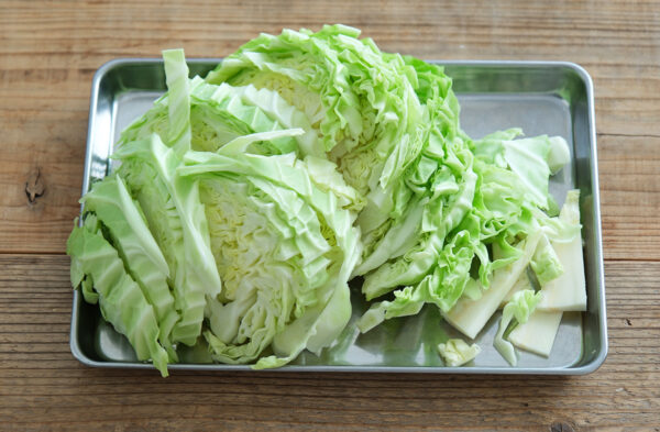 キャベツの葉は幅1cmの細切りに、キャベツの芯の硬い部分は薄切りにする。豚バラ肉は3cm幅に切る。