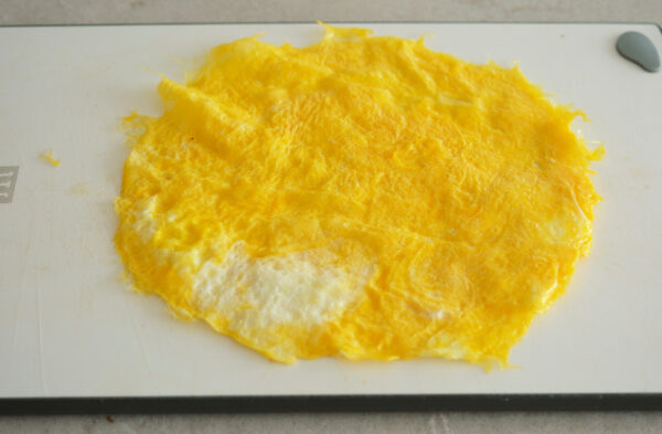 フライパンに油を熱し、溶きほぐした卵を丸く薄く広げて焼き、一度取り出す。