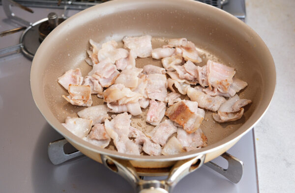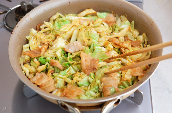 (2)のフライパンに油を熱し、豚肉を入れて炒める。豚肉の色が変わってきたらキャベツを加えてさっと炒める。