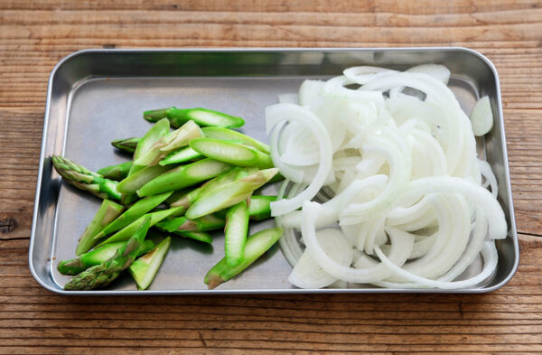 アスパラガスは斜め薄切りに、玉ねぎは薄切りにする。