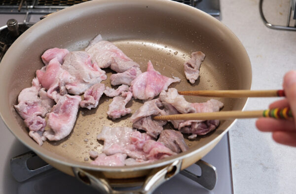 フライパンに油を熱し、豚肉を入れて色が変わるまで中火で炒める。