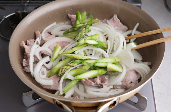 アスパラガスと玉ねぎを入れてさらに炒める。