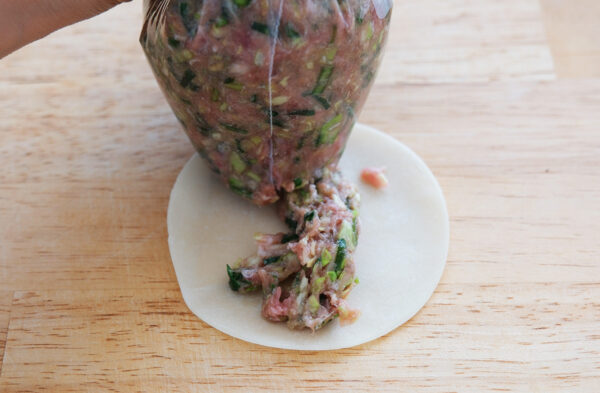 ポリ袋の先を斜めに2cmほど切り、ギョウザの皮の上にあんを棒状に絞り出す。