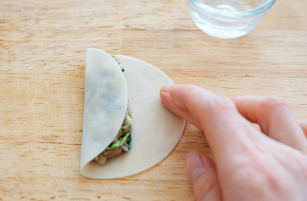 ギョウザの皮の一辺を中心に向かって折りたたみ、もう一辺に水を塗って貼りつける。