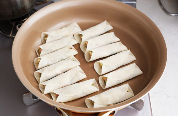 フライパンにごま油を熱し、(6)を並べて水大さじ1(分量外)を回し入れる。フタをして中火で4分蒸し焼きにする。