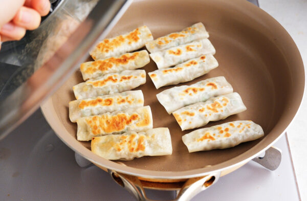 フタを取ってギョウザをひっくり返し、焼き色がつくまで2分加熱する。