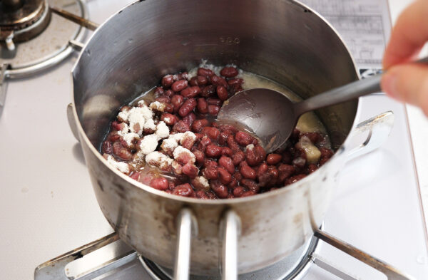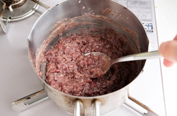あんこの水気が少なくなると焦げやすくなります。混ぜながら固さを調整してください。