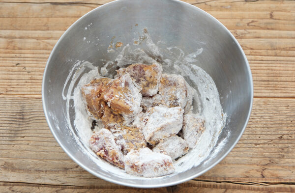 ボウルに薄力粉と片栗粉を入れて混ぜ、(2)にまぶしつける。