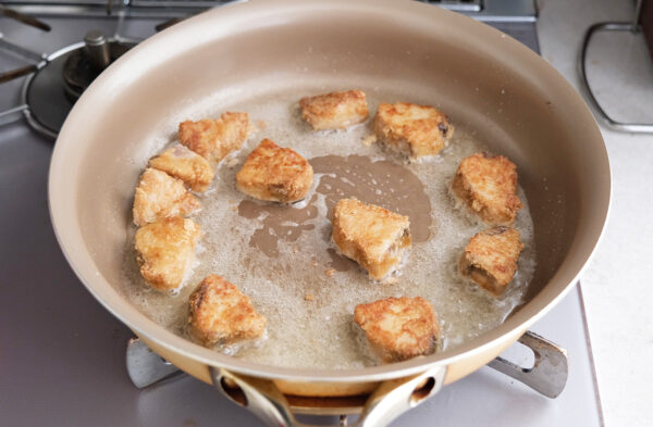 フライパンに深さ5mm程度の油を入れ、中火で熱し、(3)を入れて揚げ焼きにする。