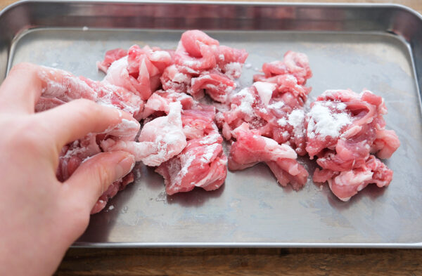 豚肉は食べやすい大きさに切り、片栗粉をまぶす。