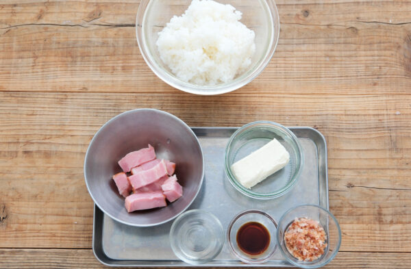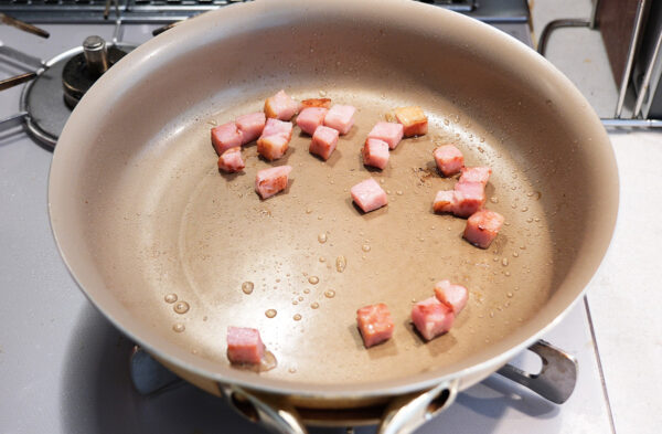 ベーコンは1cm角に切る。フライパンに油を熱し、ベーコンを入れてカリッとするまで焼く。