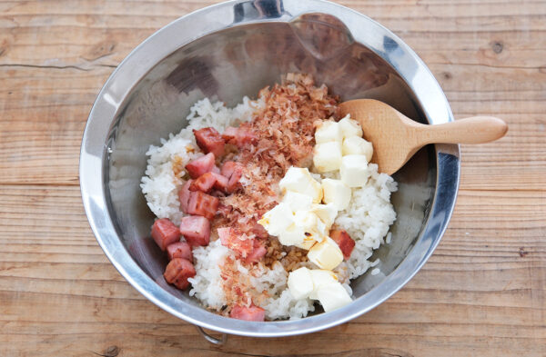 ボウルにご飯、(1)、(2)、かつお節、国産だし醤油を入れてさっくりと切るように混ぜる。