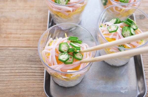カップに(1)を入れ、錦糸卵、ハム、オクラ、ミニトマトの順にバランスよくのせる。