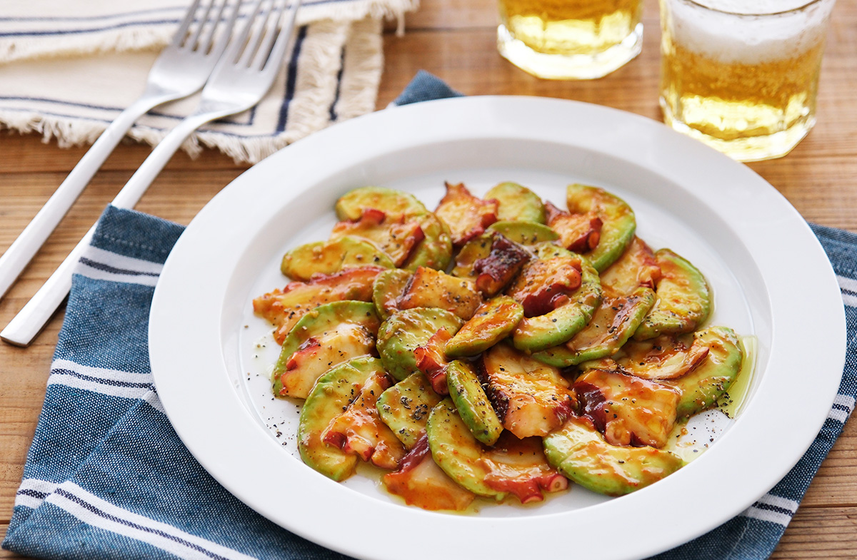 タコとアボカドに赤から鍋スティックを合わせた1品は、シンプルなのにやみつきになる味わい。キンキンに冷えたビールと相性抜群です!