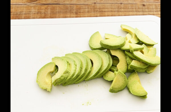 アボカドは半分に切って種を取り除き、5mm幅に切る。