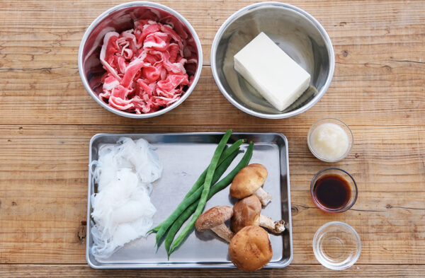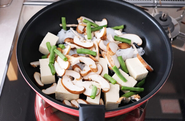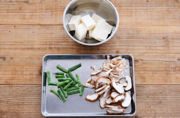 木綿豆腐は食べやすい大きさに切る。しいたけは傘を薄切りにし、軸は手でさく。いんげんは長さ3cmに切る。結び糸こんにゃくの水気を切る。