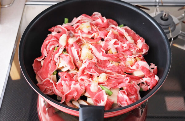 (2)の上に牛肉を広げてのせ、混ぜ合わせたAを全体に回しかける。