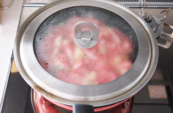 フタを取って調味料が全体になじむように優しく混ぜ、汁気がなくなるまで加熱する。