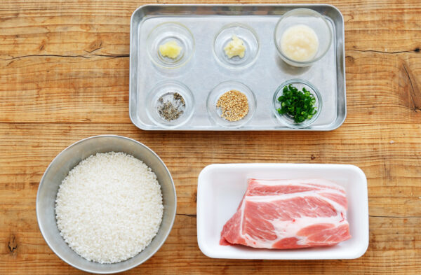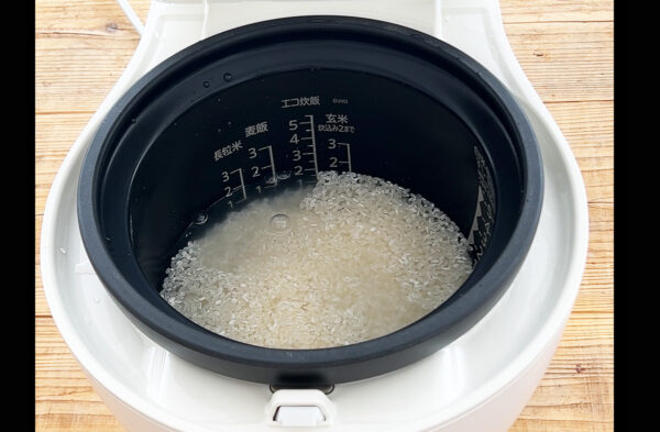 白米は研いで水気を切り、炊飯器に入れる。2合の目盛りまで水を入れる。