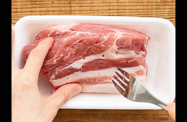 豚肉は全体にフォークで穴を開けてポリ袋に入れる。Aを加えてよくもみ込み、10分おく。