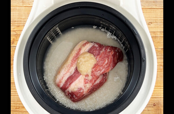 (2)に(1)の豚肉を漬け込んだ塩糀ごと入れ、炊き込みご飯モード(または通常モード) で炊飯する。