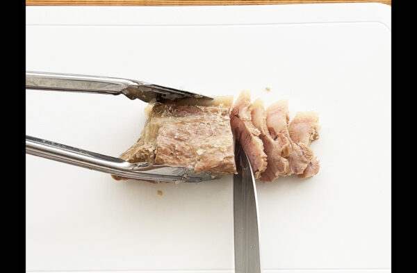 炊き上がったら豚肉を取り出してご飯をよく混ぜる。豚肉は食べやすい厚さに切る。