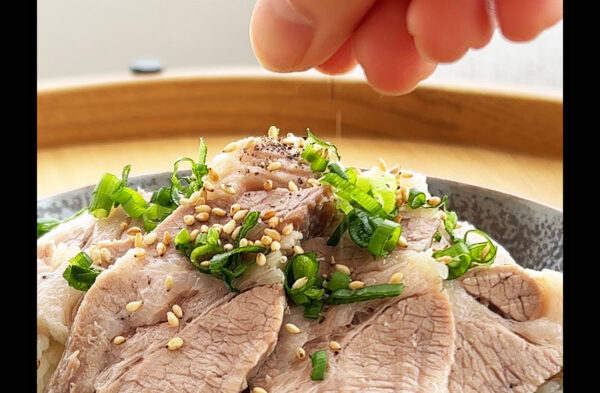 丼に(4)のご飯を盛りつけ、豚肉をのせる。刻みねぎ、白ごま、粗挽き黒こしょうをトッピングする。