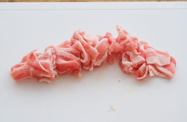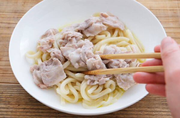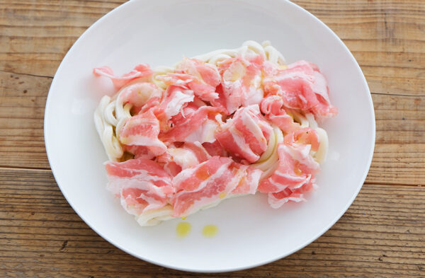 冷凍うどんは袋から出して、深めの耐熱容器に入れ、(1)を広げてのせてオリーブオイルを回しかける。ふんわりとラップをかけて電子レンジ(600W)で5分30秒加熱する。