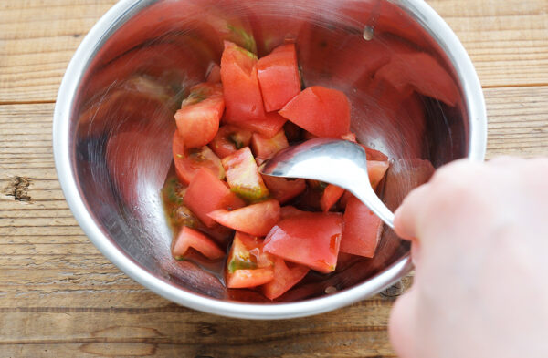 トマトは1.5cm角に切ってボウルに入れ、フォークで軽くつぶす。国産だし醤油を加えて混ぜ合わせる。