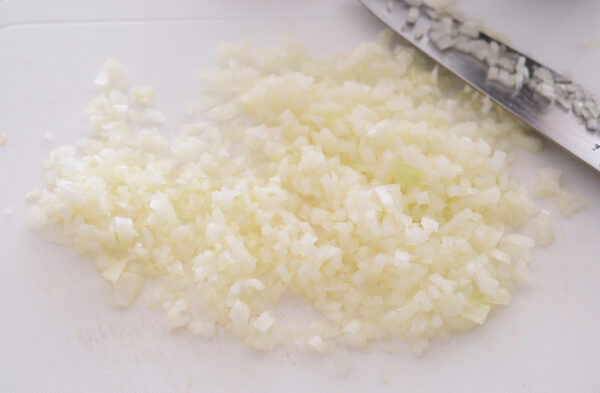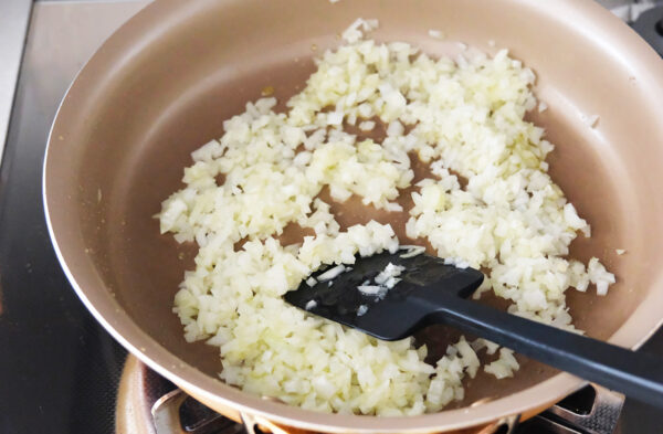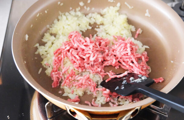 フライパンにオリーブオイル、にんにく、しょうがを入れて中火で加熱し、香りが出てきたら玉ねぎを入れて透き通るまで炒める。