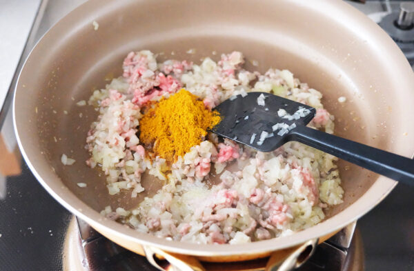 カレー粉と塩を入れて全体になじませるように1分炒める。