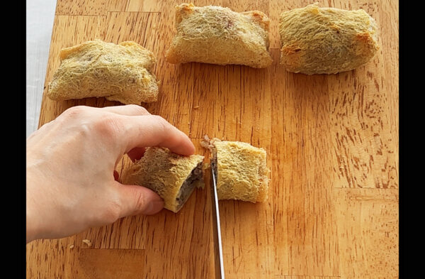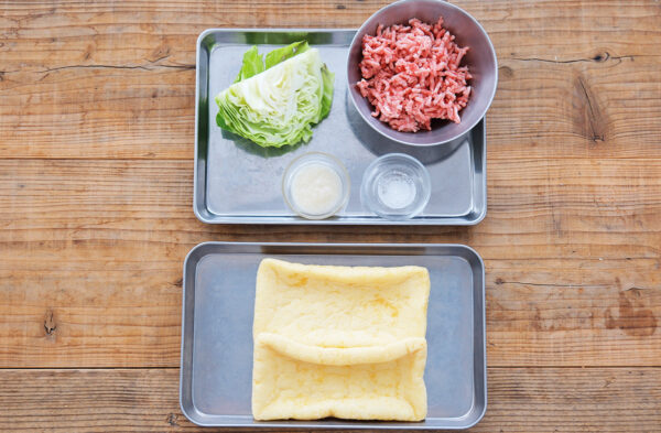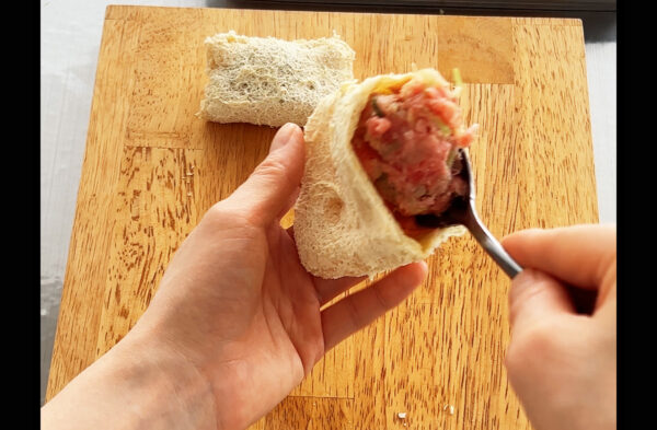 (2)を4等分して、(3)の中に詰め、具材が見えないように口を閉じる。