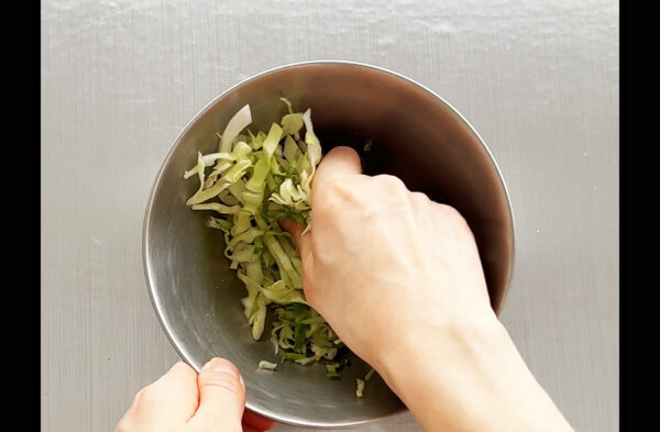 キャベツは千切りにし、塩を振ってもみ込み、10分おく。