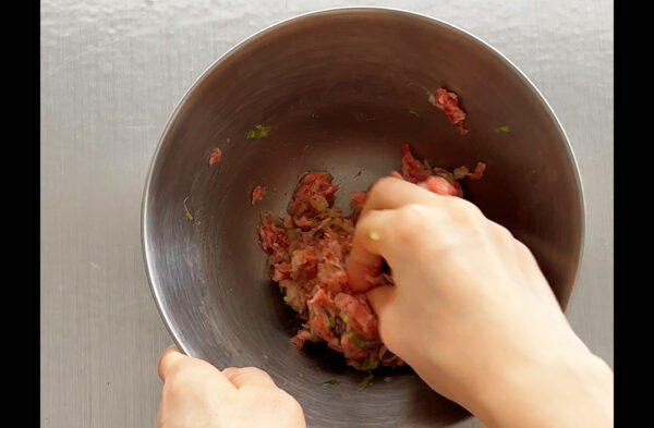 ボウルに合い挽き肉、塩糀、水気を絞った(1)を入れてよく混ぜる。