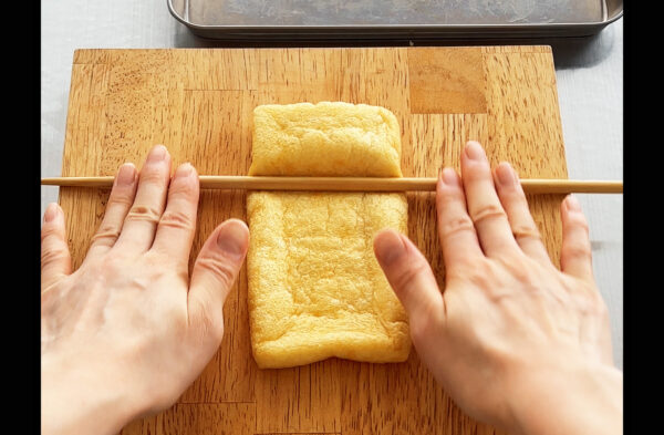 油揚げは上から菜箸を押し当てながら転がし、半分に切る。真ん中を開いて袋状にして裏返す。(正方形の油揚げを4枚使う場合は、端を切って同様に開く。)