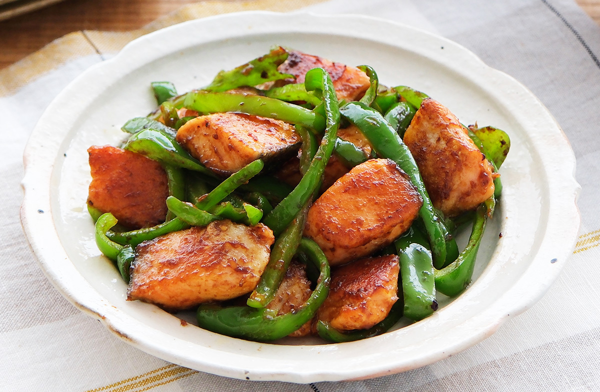 鮭とピーマンを使用したご飯のおかずにぴったりの一品。