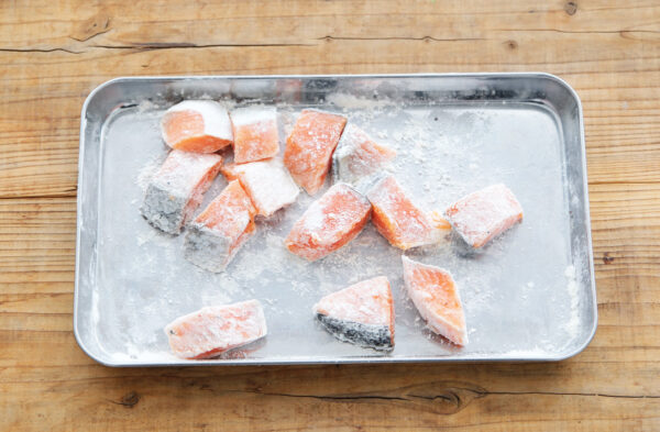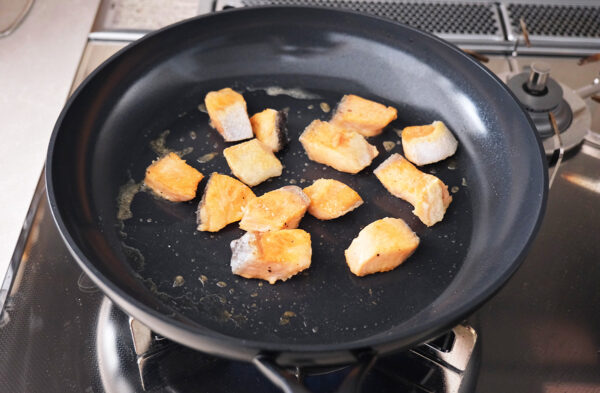 鮭を一口大に切って塩と粗びき黒こしょうをふり、薄力粉をまぶす。