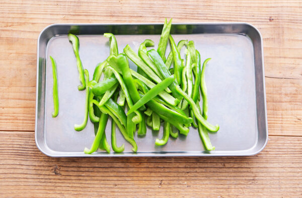 ピーマンは種を取り、幅7mmの細切りにする。